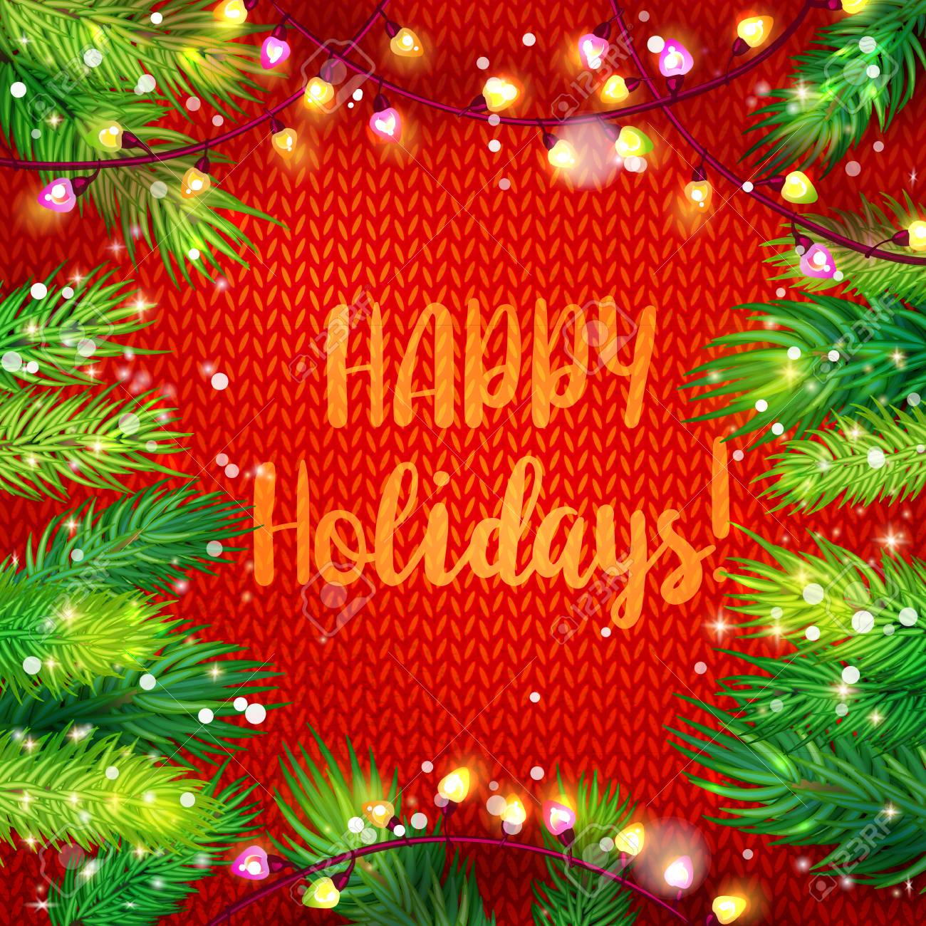 Boas Festas Cumprimentando Em Texto De Corda No Vermelho Texturizado Fundo Com Luzes De Sequencia De Caracteres Brilhantes E Galho De Pinheiro Fotos Retratos Imagenes Y Fotografia De Archivo Libres De Derecho
